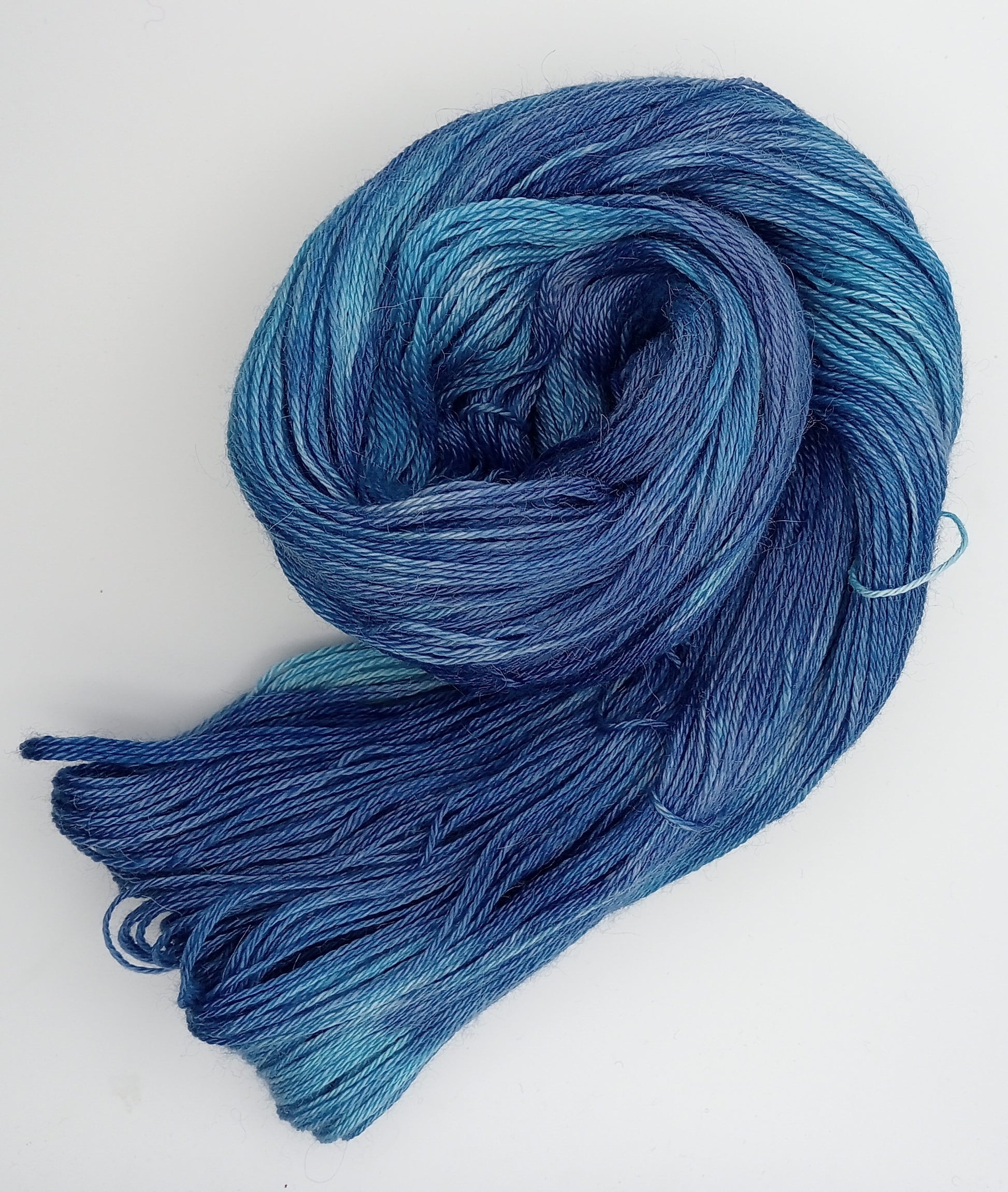 This luxury yarn combines the silky, lightweight properties of alpaca with the luxuriousness of cashmere. The unique hand dyed colours of vibrant blues in a semi-tonal colourway. will give you the opportunity to create unique projects. Enjoy the warmth and softness of this 80% alpaca, 10% silk, 10% cashmere 4 ply yarn.