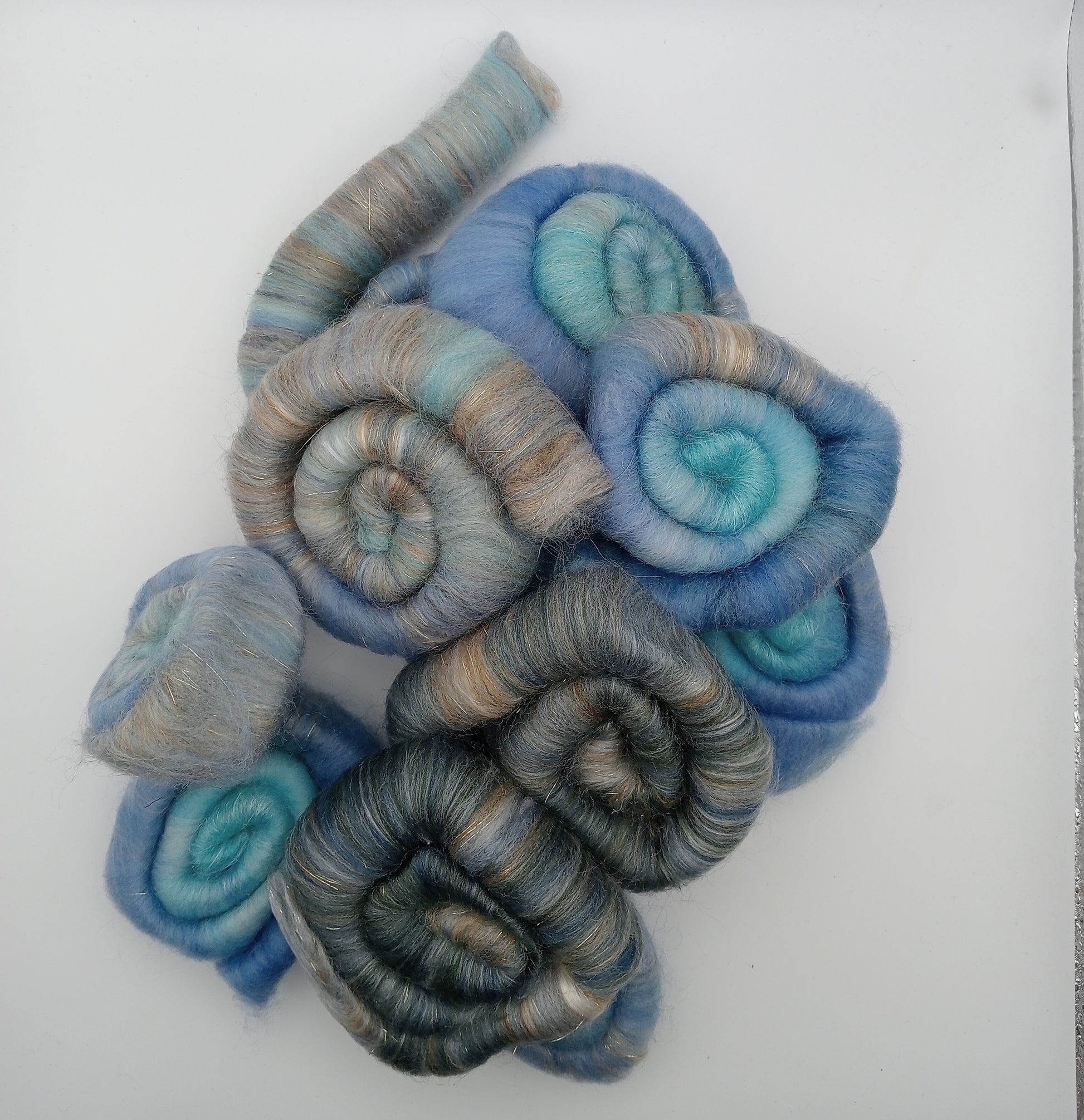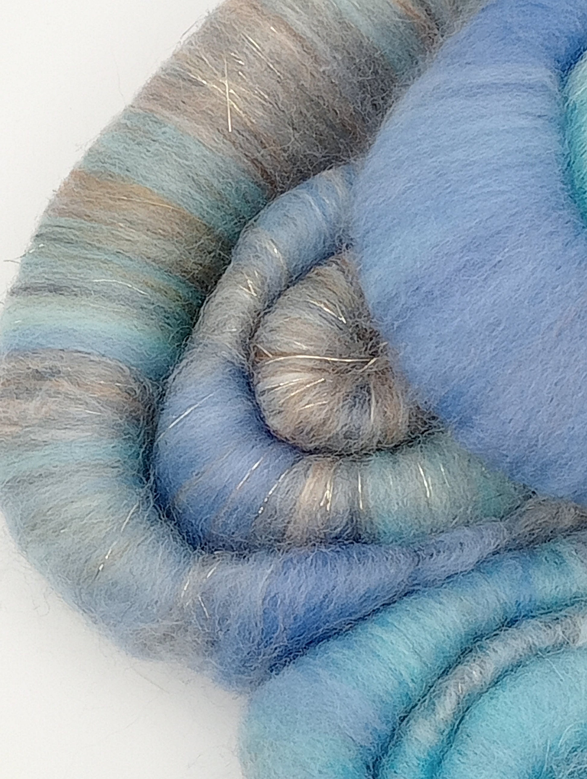 A mixed blend of hand dyed British wool with tussah silk , mulberry silk with stellina for a touch of sparkle in blues and grey tones.
